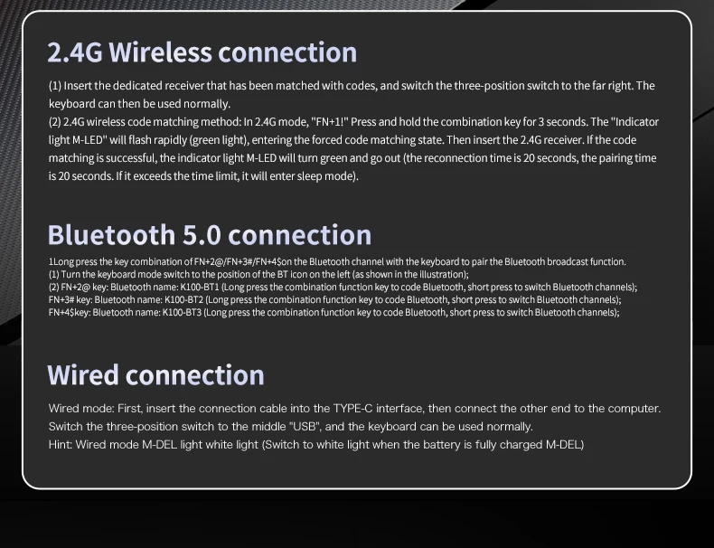 Three connection modes (Bluetooth + 2.4G + USB wired), supporting dual systems (Windows/Mac)