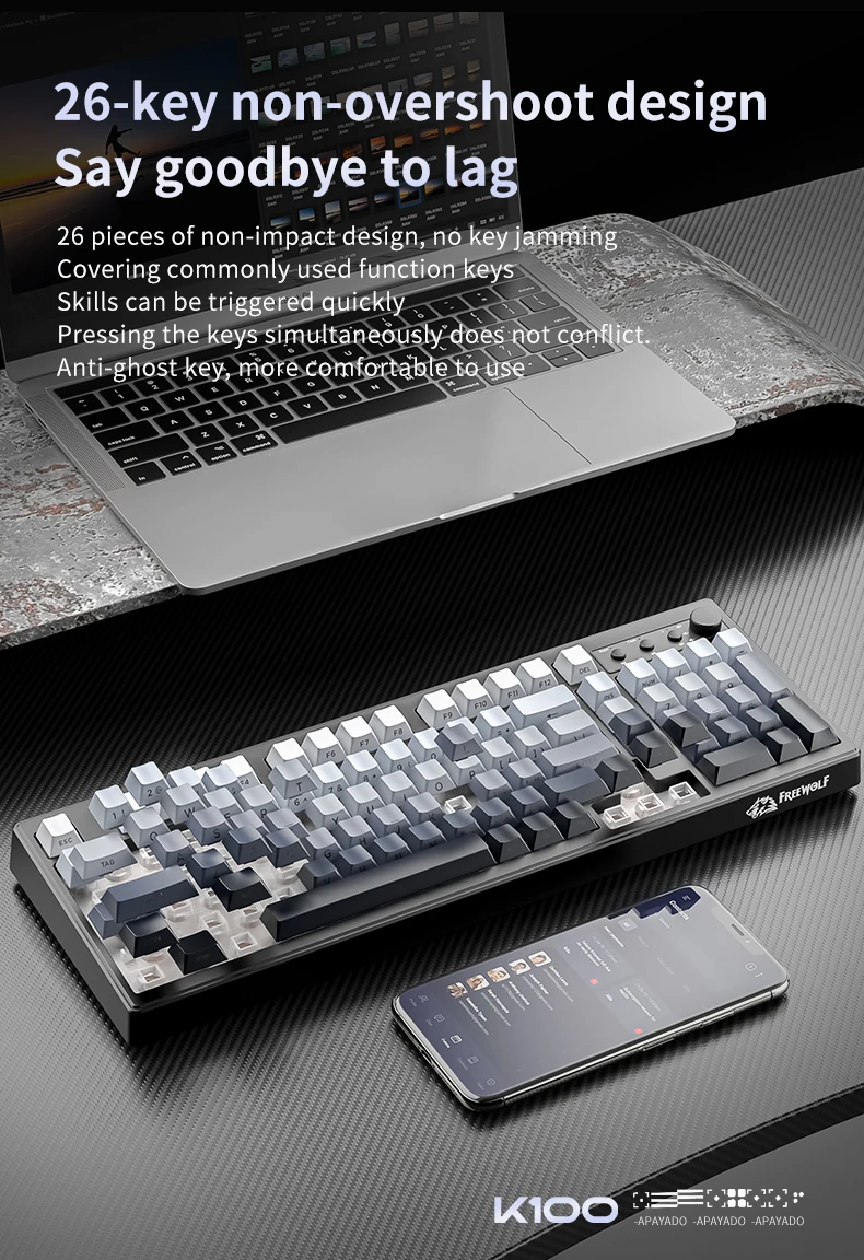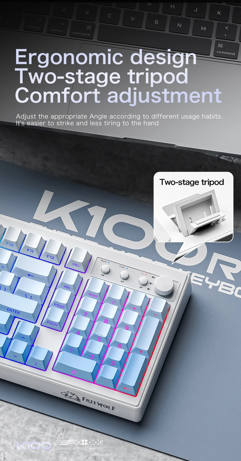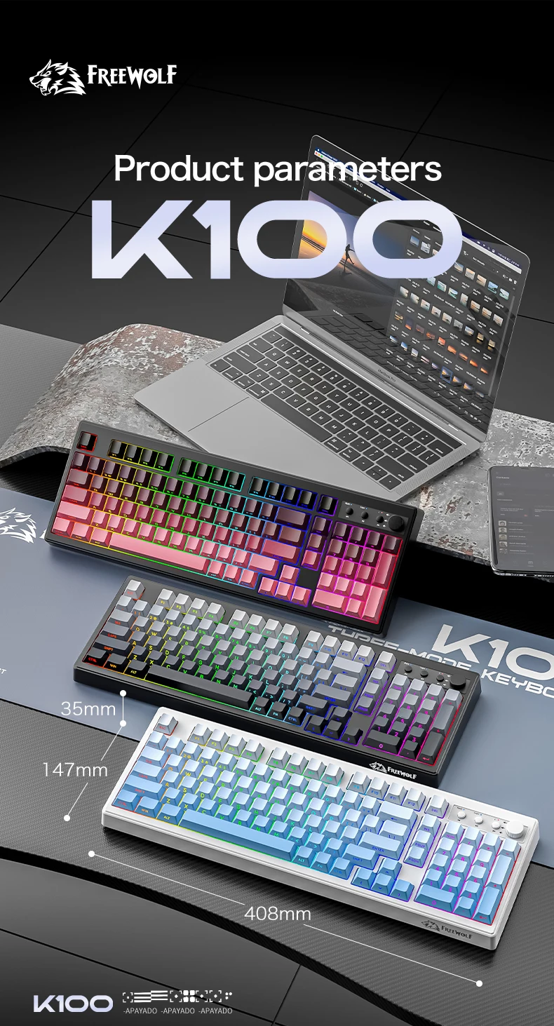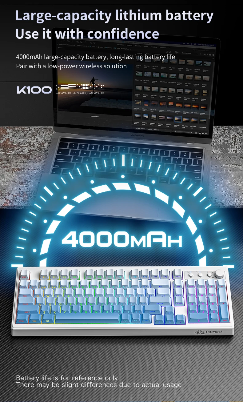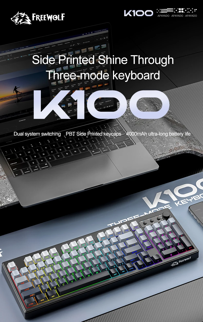 Level up your gaming with the FREEWOLF K100 keyboard. Bluetooth wireless connectivity and dual-system switching keep you flexible between devices, while side-engraved keys and vibrant RGB backlighting enhance style and visibility. Equipped with a 4000mAh battery for extended play, this keyboard combines performance, aesthetics, and convenience for PCs and laptops.