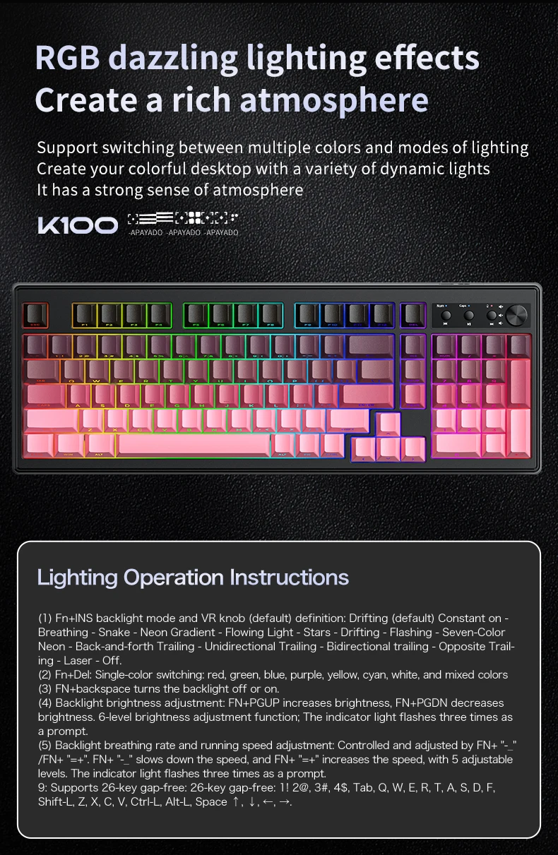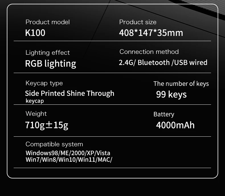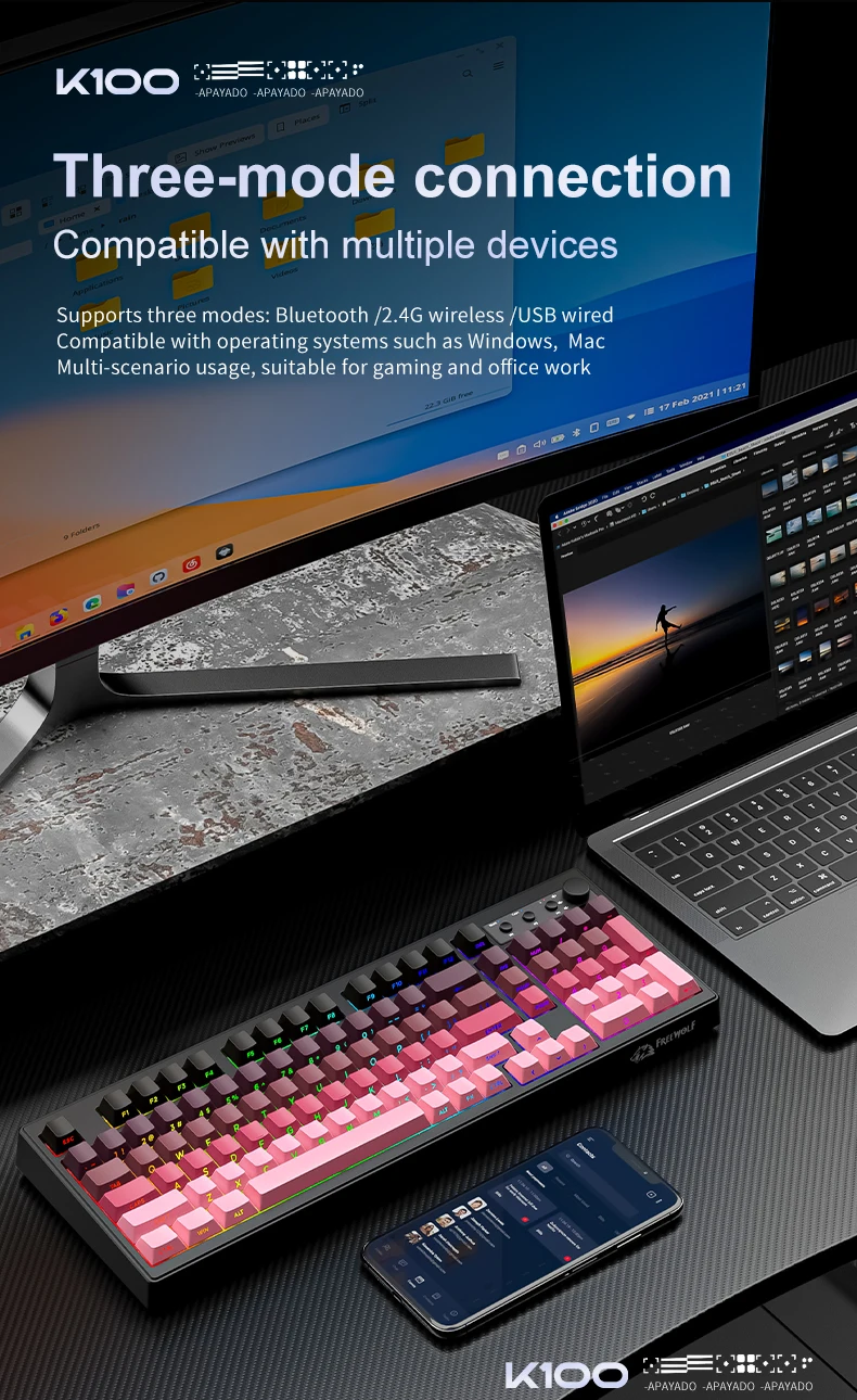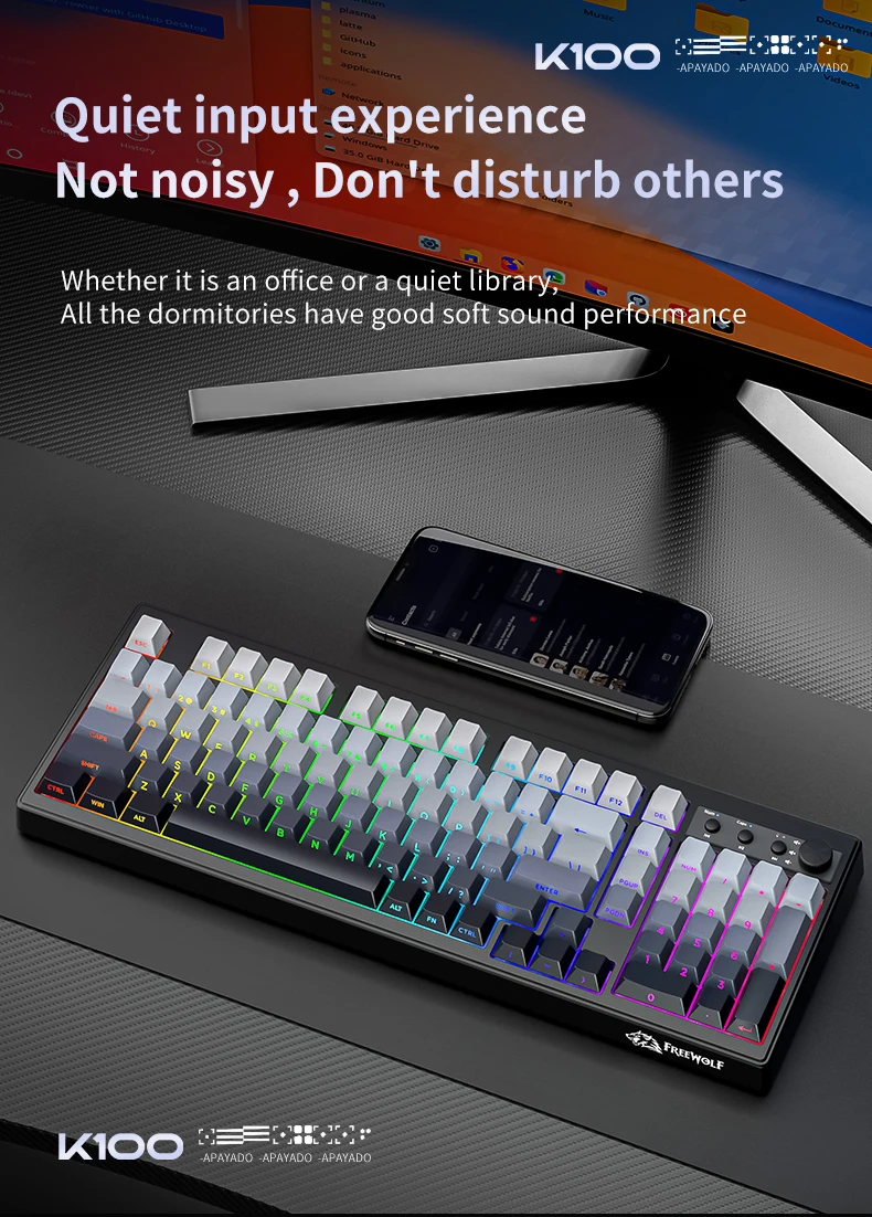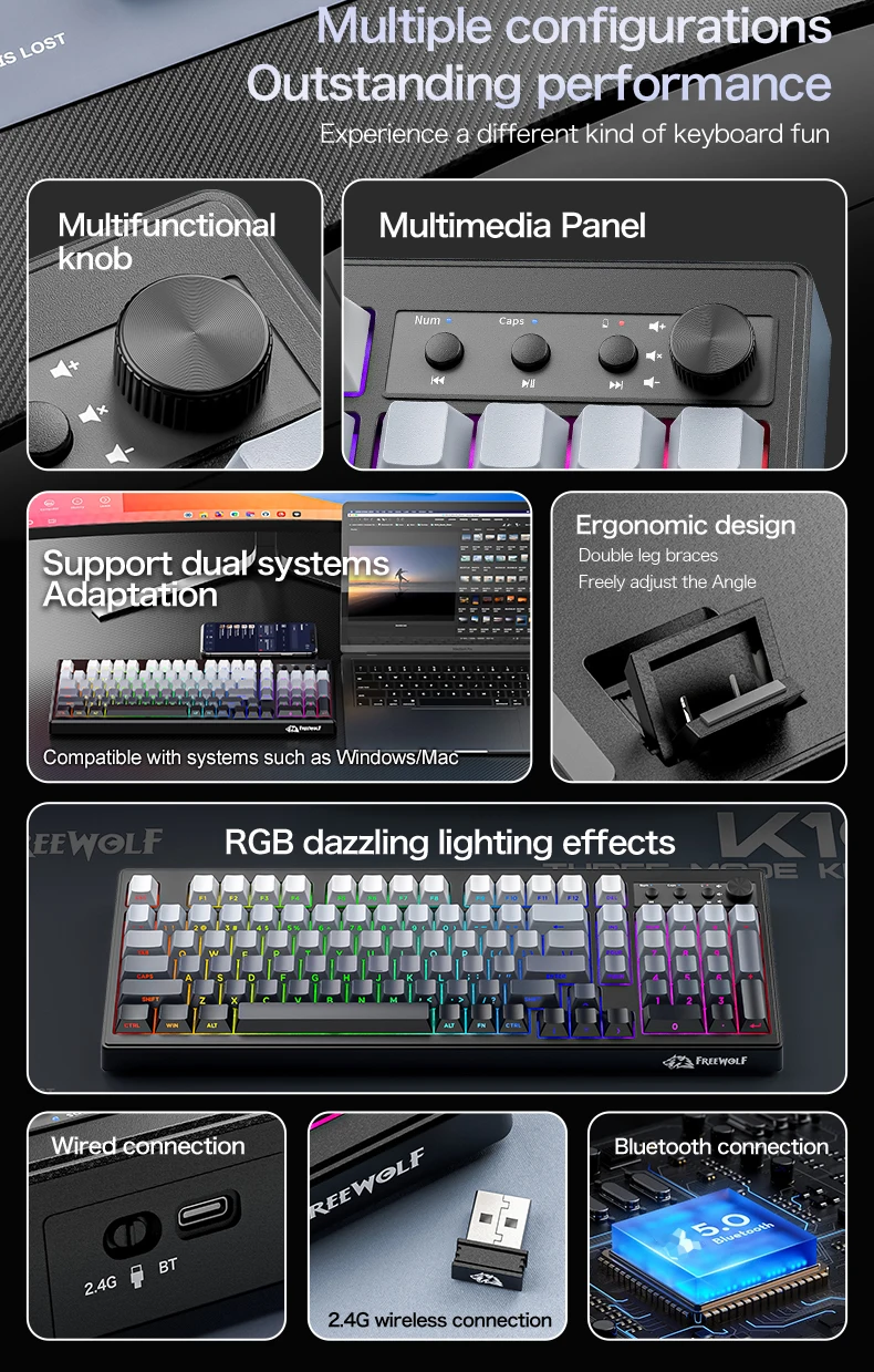 Level up your gaming with the FREEWOLF K100 keyboard. Bluetooth wireless connectivity and dual-system switching keep you flexible between devices, while side-engraved keys and vibrant RGB backlighting enhance style and visibility. Equipped with a 4000mAh battery for extended play, this keyboard combines performance, aesthetics, and convenience for PCs and laptops.